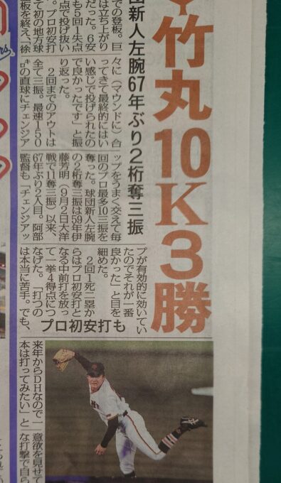 取引先野球部から巨人軍入りした竹丸投手、ㇽーキーで開幕戦で勝利してから3勝目になっていた。 巨人はいい投手を獲得したね。